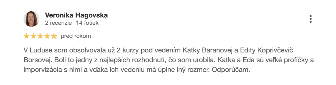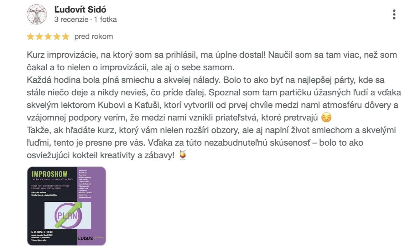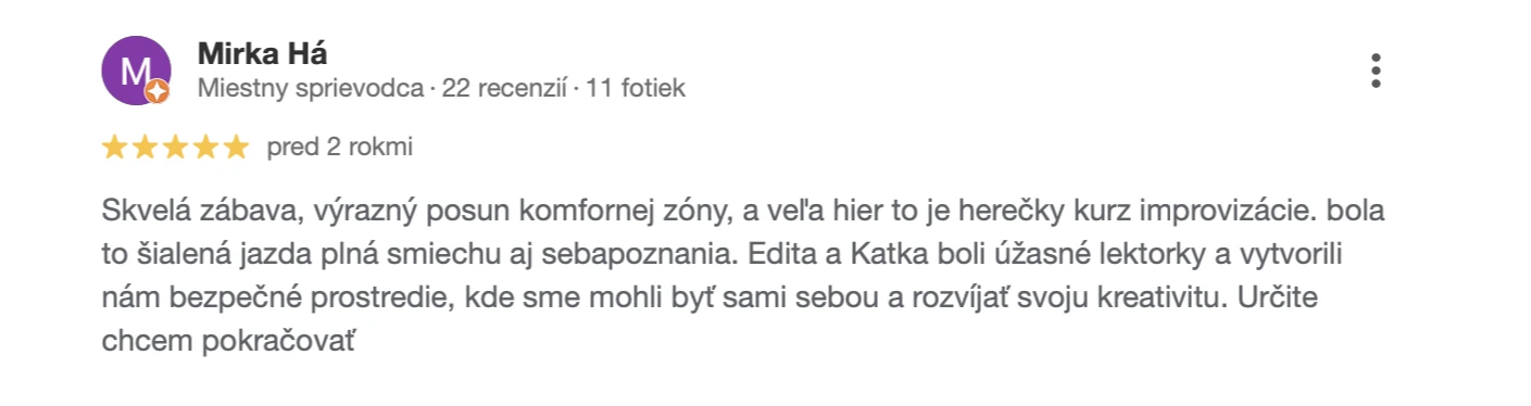 Dobrá správa je, že na to existuje jednoduché riešenie. Po absolvovaní kurzu divadelnej improvizácie budete mať viditeľné výsledky a už Vás nič nezaskočí. Dokonca budete schopní improvizovať na javisku pred divákmi a mať z toho radosť. Stante sa pánom situácie a uchopte komunikáciu do svojich rúk. Poďte s nami improvizovať a popri tom sa zabaviť a odreagovať.